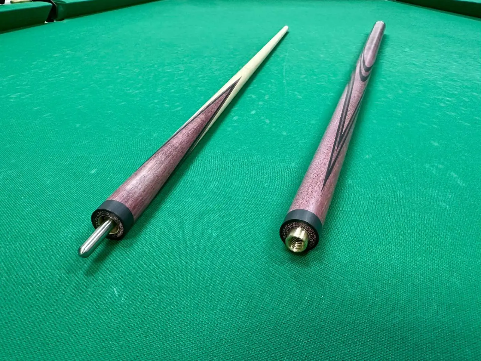 Основна частина кия виготовлена з рідкісного амаранту — дерева з насиченим бордово-фіолетовим відтінком і високою міцністю. У прикладі є благородний чорний граб, який надає конструкції стабільність і баланс. Ця комбінація не лише естетично приємна, а й функціонально виправдана: сигнал забезпечує чітку передачу сили та відмінну чутливість до удару.