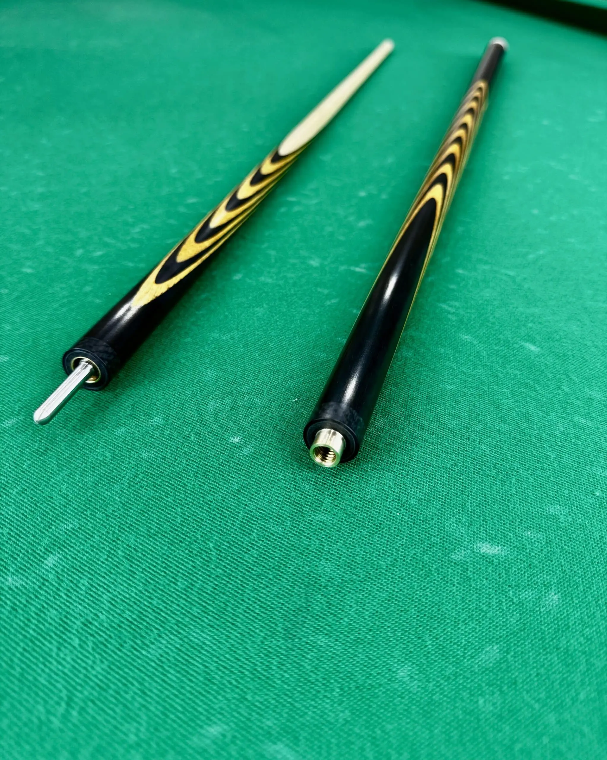 У поєднанні з чорним грабом використовується амарілло — дерево з унікальним золотисто-жовтим відтінком, що додає яскравості та тепла кию. Amarillo не лише прикрашає кий, а й покращує його ігрові характеристики завдяки природним властивостям, таким як легкість і міцність. Контраст між глибоким чорним грабом і світлим амарілло створює вражаючий візуальний образ, який підкреслює унікальність кожного кадру.
